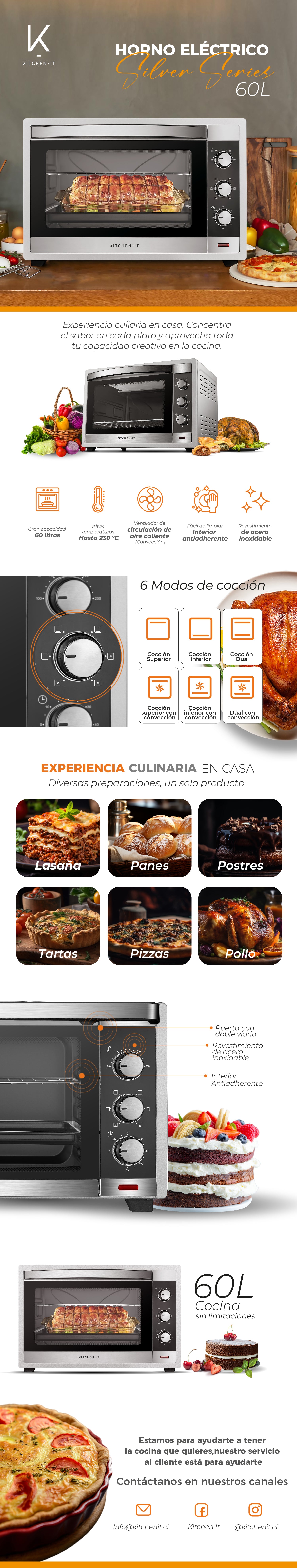 Ideal para familias numerosas o para aquellos que disfrutan de cocinar en grandes cantidades, este horno eléctrico es tu aliado perfecto para crear platillos sabrosos y nutritivos. Disfruta de una experiencia culinaria superior con el Horno Eléctrico Silver Series 60L Kitchen-it, donde la funcionalidad se encuentra con el estilo y la comodidad.