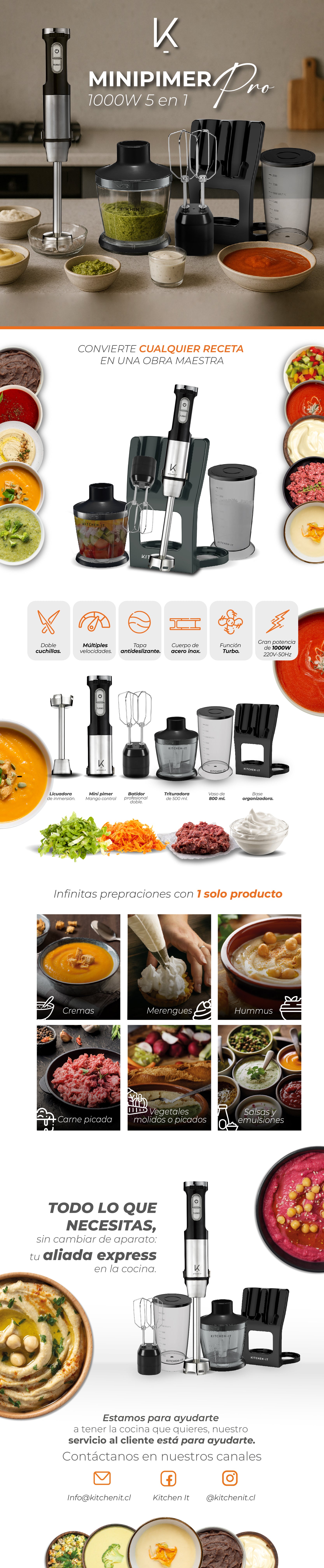 Con la Minipimer Pro 1000W 5 en 1 de Kitchen-it, transformar tu experiencia en la cocina nunca fue tan fácil. Este versátil dispositivo combina potencia profesional, diseño inteligente y una funcionalidad 5 en 1, ideal para quienes buscan practicidad sin renunciar a resultados de alta calidad.