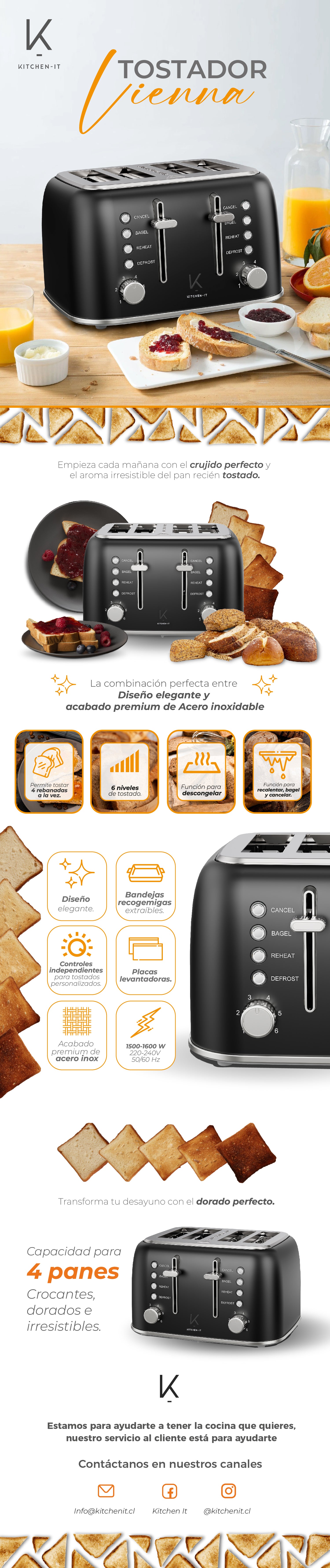 Con una potencia de 1500–1600 W, voltaje de 220–240V / 50–60 Hz, y un diseño que se adapta a cualquier cocina moderna, el Tostador Vienna eleva el desayuno a una experiencia gourmet, práctica y estilizada.