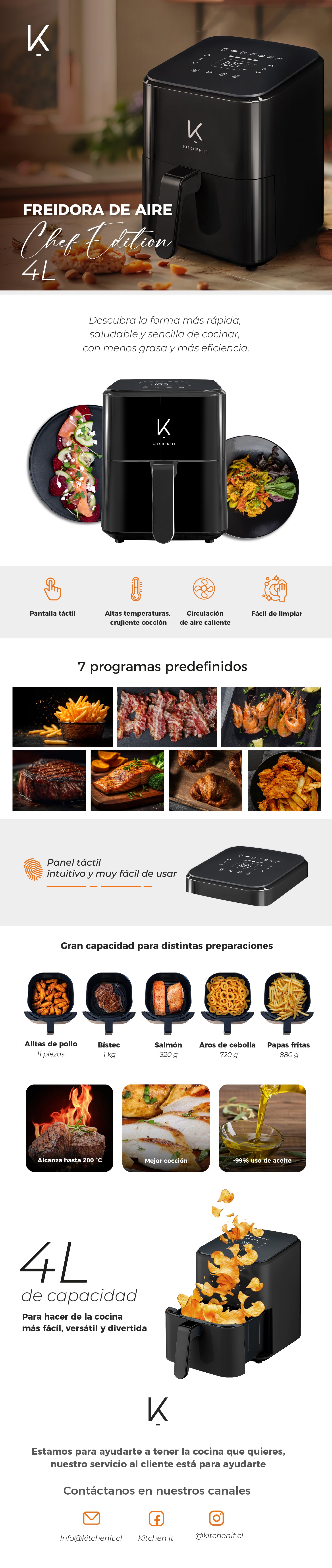 La Chef Edition 4L de Kitchen-It es tu aliada clave para transformar tus recetas en opciones deliciosas y más saludables. Con una potencia de 1350W y voltaje de 220–240 V (50/60 Hz), entrega un rendimiento eficiente y una cocción rápida.
