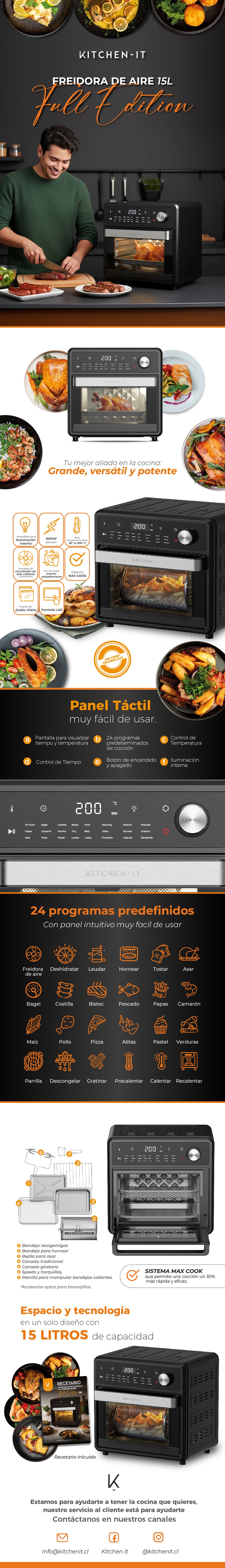 La Freidora de Aire Full Edition 15L redefine la experiencia en la cocina: combina tecnología, diseño y comodidad para preparar tus recetas favoritas de forma más saludable, práctica y deliciosa